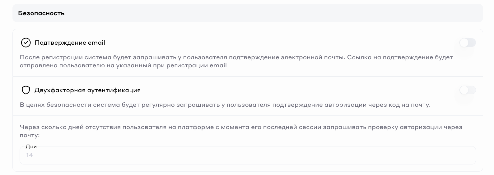 В дополнительном поле не забудьте указать через сколько дней отсутствия пользователя на платформе с момента его последней сессии запрашивать проверку авторизации через почту.