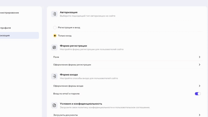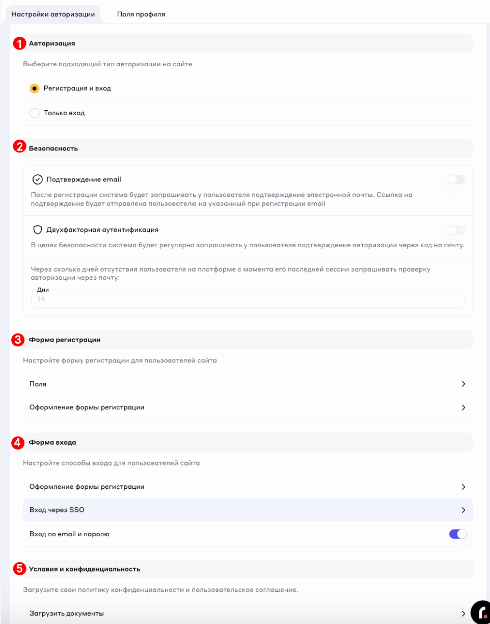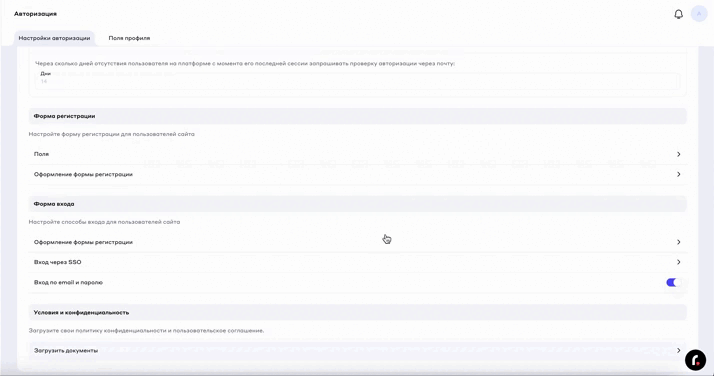 На вкладке имеется возможность настроить тип авторизации, поля регистрации, формы, текста страниц авторизации, а также загрузить юридические документы: