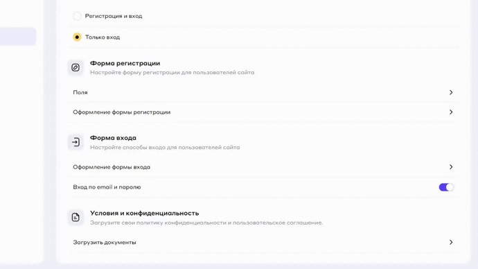 2. **Только вход.** Когда вы выберите этот параметр, пользователь не может самостоятельно зарегистрироваться на платформе. Вам необходимо добавить пользователя, после чего отправить ему необходимы данные для входа.