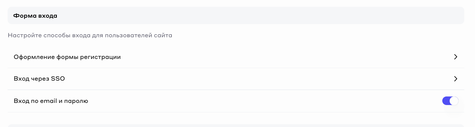 * **Вход по email и паролю.** Переключатель, позволяющий осуществлять вход по email и паролю.&#x20;